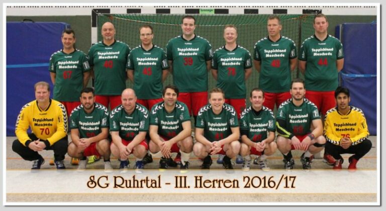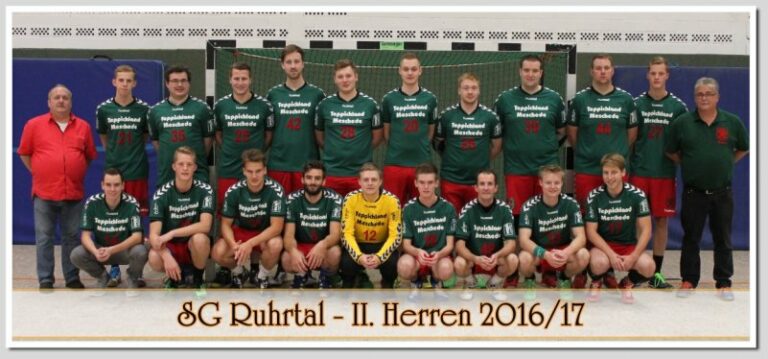 Hinten von links: Zeitnehmer Stefan Diemar, Jan-Lukas Steffen, Alexander Blech, David Jaekel, Finn Wedepohl, Laurenz Kossmann, Robin Kraas, Stefan Frimmel, Michael Glaremin, Julian Lohölter, Malte Weber, Trainer Stefan Probst. Vorne von links:Niklas Rapude, Tilmann Weber, Tristan Schmidt, Jan Gierse, Julian Schneider, Henrik Albers, Tim Flinkerbusch, Gerion Stoffels, Waldemar Schulz Es Fehlen: Christian Zebut, Alexander Frimmel, Dominik Storm, Robin Friedrich, Jasper Severin, Darius Weiß Trainer:Stefan ProbstAuf dem Lüsenberg 359821 Arnsberg 02931-5495200177-2938066 probst@sg-ruhrtal.com  Trainerstationen2005 – 2008 Jugendtrainer TV Arnsberg2008 – 2011  Fördertrainer TV Arnsberg2008 – 2010  Trainer JSG Sauerland 2010 – 2011  Trainer TVA 2 (Herren) und Jugendtrainer2011 – 2012  Trainer weibl. Jugend TV Arnsberg2012 – 2016 Trainer 1. Damen SG Ruhrtal2016 – … Trainer 2. Herren SG Ruhrtal Spielklasse: 1. Kreisklasse Trainingszeiten: montags, 20.30 – 22.00 Uhr, Ruhrtalhalle Oeventropdonnerstags, 20:30 – 22.00 Uhr, Ruhrtalhalle Oeventrop Nr Mannschaft Spiele + ± – Tore D Punkte 1 HSG Hohenlimburg 3 20/20 15 1 4 622:525 97 31:9 2 TSV Bigge-Olsberg 20/20 13 4 3 513:448 65 30:10 3 BC Eslohe 20/20 10 3 7 487:485 2 23:17 4 HVE Villigst-Ergste 3 20/20 10 2 8 511:486 25 22:18 5 Letmather TV 3 20/20 10 1 9 477:447 30 21:19 6 TV Westfalia Halingen 3 20/20 9 1 10 466:506 -40 19:21 7 SG Ruhrtal 2 20/20 8 1 11 546:542 4 17:23 8 DJK SG Bösperde 2 20/20 7 3 10 510:517 -7 17:23 9 TV Neheim 2 20/20 7 1 12 469:544 -75 15:25 10 HSG Schwerte-Westhofen 2 20/20 7 0 13 489:520 -31 14:26 11 TV Wickede 2 20/20 5 1 14 464:534 -70 11:29 Nr Datum Zeit Heim Gast Tore Punkte 002 10.09.16 16:30 SG Ruhrtal 2 HSG Schwerte-Westhofen 2 16:21 0:2 005 17.09.16 15:15 TV Westfalia Halingen 3 SG Ruhrtal 2 31:29 2:0 027 05.11.16 17:15 SG Ruhrtal 2 TSV Bigge-Olsberg 25:25 1:1 031 12.11.16 17:45 BC Eslohe SG Ruhrtal 2 29:27 2:0 034 19.11.16 16:00 SG Ruhrtal 2 HVE Villigst-Ergste 3 26:21 2:0 037 26.11.16 18:00 SG Ruhrtal 2 HSG Hohenlimburg 3 34:39 0:2 041 03.12.16 17:30 DJK SG Bösperde 2 SG Ruhrtal 2 24:22 2:0 046 11.12.16 17:00 SG Ruhrtal 2 TV Wickede 2 24:22 2:0 049 17.12.16 16:30 TV Neheim 2 SG Ruhrtal 2 29:26 2:0 053 14.01.17 17:15 SG Ruhrtal 2 Letmather TV 3 26:18 2:0 058 22.01.17 15:15 HSG Schwerte-Westhofen 2 SG Ruhrtal 2 25:26 0:2 062 28.01.17 17:15 SG Ruhrtal 2 TV Westfalia Halingen 3 39:27 2:0 079 05.03.17 18:00 HVE Villigst-Ergste 3 SG Ruhrtal 2 29:26 2:0 082 11.03.17 18:00 TSV Bigge-Olsberg SG Ruhrtal 2 26:22 2:0 086 18.03.17 15:30 SG Ruhrtal 2 BC Eslohe 23:25 0:2 093 26.03.17 12:45 HSG Hohenlimburg 3 SG Ruhrtal 2 38:34 2:0 097 01.04.17 18:00 SG Ruhrtal 2 DJK SG Bösperde 2 31:29 2:0 101 29.04.17 16:45 TV Wickede 2 SG Ruhrtal 2 26:27 0:2 104 06.05.17 16:15 SG Ruhrtal 2 TV Neheim 2 34:28 2:0 107 13.05.17 14:00 Letmather TV 3 SG Ruhrtal 2 30:29 2:0