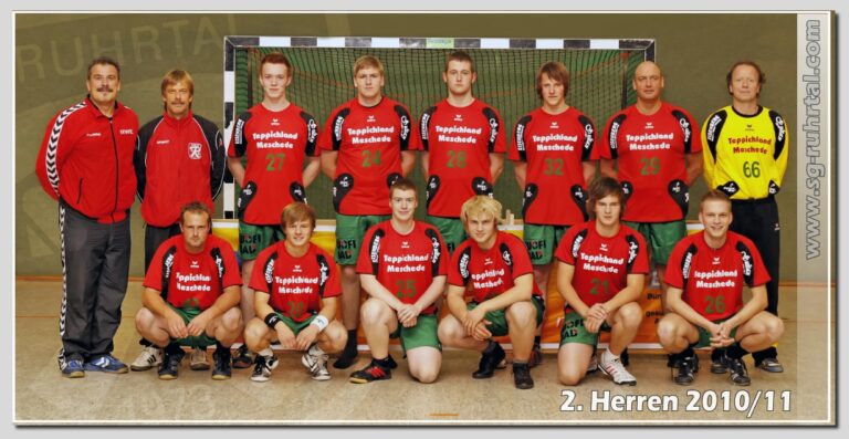 Hinten von links:Sekretär Michael Bräu, Jürgen Maas, Michael Storm, Frank Pelmer, Markus Basler, Bastian Damböck, Kunibert Kord, Betreuer Jochen Henke Vorne von links:Mirco Steffen, Thomas Röttger, Christof Weiss, Daniel Hoffmann, Dennis Dudek, Kai Glittenberg, Michael Rosenberger Nicht im Bild:Jürgen Bläsing, Christian Schlupp, Matthias Klute, Karl-Heinz Wolf, Mark Storm, Reinhard Struwe Trainer: Jochen HenkeOesterfeldweg 4059823 Arnsberg 02937-2010 Trainer: Jürgen BläsingIm Surkhahn 159823 Arnsberg 02931-6727   Spielklasse: 2. Kreisklasse Trainingszeiten: Mittwochs, 20.30 – 22.00 Uhr, Sporthalle Freienohl   Nr Mannschaft Spiele + ± – Tore D Punkte 1 TV Arnsberg 3 10/10 10 0 0 295:160 135 20:0 2 SG Ruhrtal 2 10/10 6 1 3 233:223 10 13:7 3 SG Ruhrtal 3 10/10 5 0 5 209:222 -13 10:10 4 VfS 59 Warstein 3 10/10 3 2 5 220:255 -35 8:12 5 BC Eslohe 10/10 3 0 7 186:213 -27 6:14 6 TuS Union Scharfenberg 10/10 1 1 8 163:233 -70 3:17   Nr Datum Zeit Heim Gast Tore Punkte 002 11.09.10 17:30 SG Ruhrtal 3 VfS 59 Warstein 3 19:12 2:0 007 18.09.10 16:00 TV Arnsberg 3 SG Ruhrtal 3 31:7 2:0 012 02.10.10 19:30 SG Ruhrtal 3 SG Ruhrtal 2 25:31 0:2 015 31.10.10 17:00 TuS Union Scharfenberg SG Ruhrtal 3 19:30 0:2 021 27.11.10 17:30 SG Ruhrtal 3 BC Eslohe 32:28 2:0 030 15.01.11 18:00 VfS 59 Warstein 3 SG Ruhrtal 3 23:28 0:2 035 29.01.11 15:45 SG Ruhrtal 3 TV Arnsberg 3 17:27 0:2 040 12.02.11 19:30 SG Ruhrtal 2 SG Ruhrtal 3 34:25 2:0 043 26.02.11 19:30 SG Ruhrtal 3 TuS Union Scharfenberg 26:17 2:0 049 19.03.11 18:15 BC Eslohe SG Ruhrtal 3 0:0 2:0