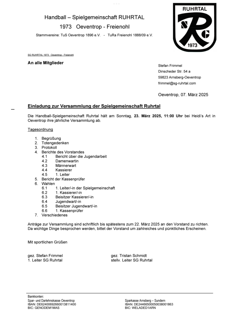 Gemischte E-Jugend: SG Ruhrtal vs. HVE Villigst-Ergste 11:19 (6:9) Spieltag Nummer 2 in der Kreisliga für unsere Kids der gemischten E-Jugend und somit auch das 1. Heimspiel der Saison.Auf Grund von krankheitsbedingten Absagen standen unsere Kids mit einem 9er Kader der HVE Villigst-Ergste gegenüber.Die SGR trat mit einem gemischten 2016er / 2015er Kader gegen eine durchweg besetzte 2015er Mannschaft an.Der Start ins Spiel gelang unseren Kids besser als dem Gegner und es stand nach 4 Minuten 4:1! Tolle Spielzüge und ein toller Aufbau sowie eine läuferisch starke Abwehrarbeit konnte geboten werden. Allerdings verloren wir nach der starken Anfangsphase den Spielfluss und die klaren Aktionen. Ferner änderte der Gegner sein Abwehrverhalten, welches nun sehr körperlich wurde.Halbzeitstand war ein 6:9. In der Halbzeit wurden alle Kids nochmals eingeschworen und es ging wieder raus auf die Platte.Über ein 8:11 sowie 10:14 waren wir stets in Reichweite, aber ab der 30 Minuten schwanden die Kräfte, sich aus den permanenten Klammergriffen zu befreien. So kam leider kein Spielfluss zu Stande und am Ende mussten wir uns mit 11:19 geschlagen geben. Trotzdem großes Kompliment an alle Kids, die sich nie aufgaben und alles reingeworfen haben. SGR: Berat, Elias, Liam, Felix (3), Max (4), Lunas, Lia, Gideon (4) und Laura Weibliche D-Jugend: HSG Schwerte-Westhofen vs. SG Ruhrtal 9:24 (4:11) Heute ging es für unsere weibliche D-Jugend auf die weiteste Auswärtsfahrt nach Schwerte. Noch in der Sommerrunde hatte man hier im Rahmen des Final4 gewinnen können.Die Mädels hatten jedoch großen Respekt – im letzten Spiel gegen Schwerte haben die Gegnerinnen hart zugepackt und stark verteidigt. Weiterhin haben die Schwerterinnen genau wie wir noch keinen Punkt in der Hauptrunde abgegeben, sodass hier ein echtes Topspiel auf dem Programm stand.Von Anfang an war die Marschroute also klar: gegen die harte Abwehr gute Chancen rausspielen und hinten noch kompakter stehen. Dieser Plan konnte auch von Beginn an wunderbar umgesetzt werden. Mit flinken Angriffsaktionen, tollen Würfen aus dem Rückraum und einer guten Übersicht konnten wir früh in Führung gehen.Bereits zur Pause stand es 4:11 für uns, sodass wir in der zweiten Halbzeit unser Spiel variieren konnten, und neue Positionen ausprobieren konnten.Alles in allem ein sehr gelungenes Spiel, woran man gut erkennen konnte wie sehr sich die Mannschaft seit der Sommerrunde bereits entwickelt hat. SGR: Emma im Tor; Hanna, Charlotte, Louisa, Sophie, Mia, Ida, Paula, Olivia Männliche D-Jugend: SG Ruhrtal vs. DJK Bösperde (13:9) 30:14 Nach furiosem 7:2-Start nach 8 Minuten war es in Halbzeit 1 ein ausgeglichenes Spiel. Nach der kurzen Ansprache (es gab nichts zu mäkeln) in der Kabine war es ein 6:0-Lauf bis die Bösperder ihren ersten Treffer in der zweiten Halbzeit zum 19:10 erzielen konnten.Herausragend war bis dahin die Abwehrleistung – immer wieder wurde der Ball auch sauber heraus gespielt um ihn dann in schönen Angriffen im Bösperder Tor unterzubringen.Eine wiederum ausgezeichnete Leistung zeigte Neu-Torwart Michel: wieder und wieder wehrte er Bälle reaktionsschnell ab und war auch bei den beiden 7m für Bösperde nicht zu überwinden.Ausgezeichnet waren auch die spielerischen Lösungen im Angriff, wo Jasper mehrfach die Kreisläufer frei anspielen konnte, wobei es hier auch vier Fahrkarten über das Tor gab. Eine geschlossene, mannschaftliche Leistung führte zum überzeugenden 30:14 Sieg.Nächste Woche Sonntag geht es dann zur HSG nach Hohenlimburg, die ihr erstes Spiel gegen den Meisterschaftsfavoriten Letmathe mit 14:36 verloren haben. SGR: Michel; Benedikt (13), Phil (2), Leon (3), Jannis (2), Jasper (5), Albison (5), Johann, Gustav Männliche C-Jugend: SG Menden Sauerland Wölfe 1 vs. SG Ruhrtal 46:10 (25:4) „Ziel: keine 50 kassieren und mehr als 3 Tore werfen“ – mit dieser Vorgabe ging es am frühen Sonntag nach Menden. Um das Ergebnis richtig einordnen zu können: Menden wollte eigentlich in einer höheren Liga spielen, wir eine Klasse tiefer. Die Voraussetzungen unterstreichen die Ergebnisse gegen SSV Meschede im Vorfeld:SSV – SGR : 35:16Menden – SSV : 34:11Unterm Strich bleibt stehen: Ziel erreicht!Zudem waren die Voraussetzungen denkbar schlecht: Top-Torschütze Vincent musste morgens kurzfristig krankheitsbedingt passen und auch Torwart Tom Weyer war nicht verfügbar.Daher musste Benedikt aus der m. D aushelfen, und das gar nicht mal schlecht! Respekt für die gute Leistung. Allerdings fehlte er dann im Feld. Zudem waren mit Leon und den „Jungjahrgängen“ Albison und Jannis weitere D-Jugendliche „am Start“.Simon spielt erst seit ein paar Wochen Handball, ist mit seiner Geschwindigkeit und auch Wurfkraft eine echte Bereicherung ! SGR: Benedikt; Ben (1), Felix (1), Albison (1), Jeremias (1), Moritz, Simon (6), Leon B., Leon D., Phil D., Jannis Männliche B-Jugend: JSG 2 vs. Letmather TV 2 24:22 (14:10) Am Samstag hatten wir den Letmather TV 2 zu Gast. Hier standen die Vorzeichen nicht ganz so gut, da man nur mit 7 Spielern das Spiel bestreiten musste.Der Beginn war sehr ausgeglichen – Stand nach 10 Minuten 6:5 für die JSG. Die Abwehr stand gut und im Angriff konnten einige gute Aktionen gezeigt werden, sodass man mit einem 14:10 in die Halbzeitpause ging. Die Trainer fanden in der Pause die richtigen Worte. Man begann die zweite Halbzeit hoch konzentriert und motiviert. Spielstand nach 35 Minuten 18:15 für die JSG.Leider ließen die Kräfte ab diesem Zeitpunkt etwas nach und Letmathe war zurück im Spiel 22:22 (45 Min.). Die Mannschaft legte nochmal alles in die Waagschale und gewann das Spiel am Ende verdient mit 24:22. Großes Kompliment an die Mannschaft. SGR: Clemens, Mats, Jonah, Anton, Jonas, Joel und Tim